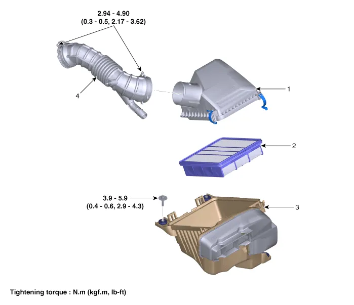 | 1. Air cleaner cover 2. Air cleaner element | 3. Air cleaner body & air duct 5. Air intake hose |