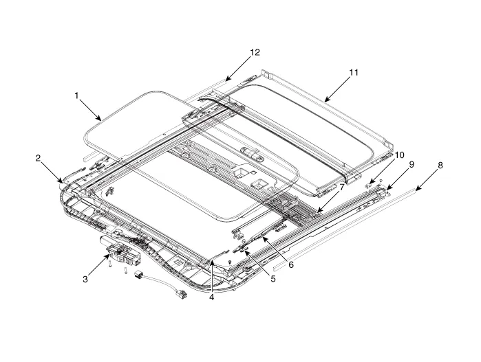 | 1. Glass panel assembly 2. Deflector 3. Motor assembly 4. Spring base assembly 5. Seth plate assembly 6. Guide assembly | 7. Frame sub assembly 8. Seal tape 9. Rear drip 10. Stopper 11. Sunshade assembly 12. Drip rail assembly |