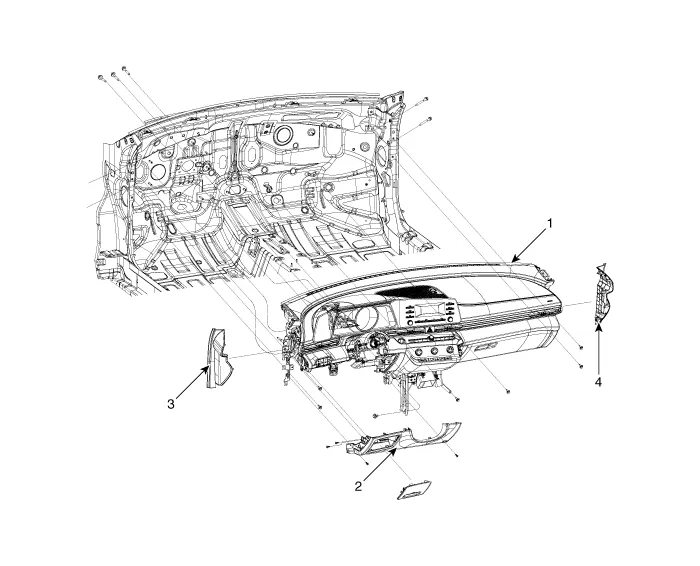 | 1. Crash pad assembly 2. Crash pad lower panel | 3. Crash pad side cover [LH] 4. Crash pad side cover [RH] |