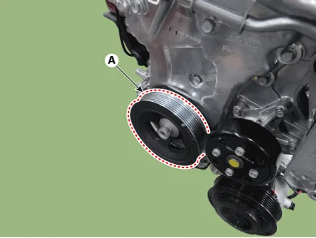 | 3. | Remove the crankshaft damper pulley (A). Tightening torque : 66.7 - 70.6 N.m + 98 - 102°[6.8 - 7.2 kgf.m + 98 - 102°, 49.2 - 52.1 lb-ft + 98 - 102°] |