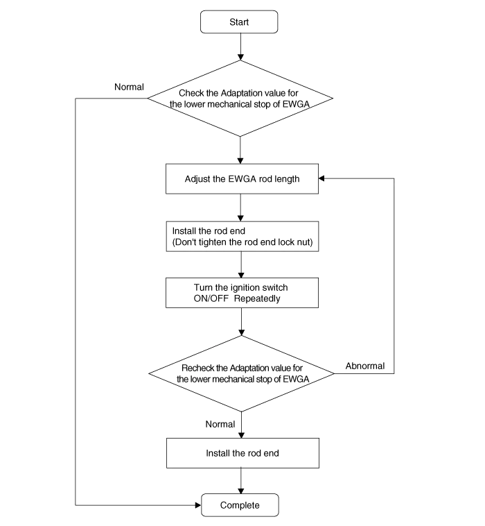 | 12. | Check the "Adaptation value for the lower mechanical stop of EWGA" after selecting "Current Data" menu. Turn the ignition switch ON/OFF repeatedly until the changing value of the "Adaptation value for the lower mechanical stop of EWGA" is within 0.05V. | •