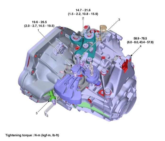 | 1. Control shaft complete 2. Control cable bracket 3. Back-up lamp switch | 4. Manual transaxle bracket 5. Concentric slave cylinder |