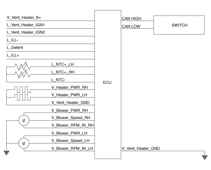 Components and components location Components1. Driver seat heater switch2. Passenger seat heater swtich3. 2nd seat heater switch Schematic diagrams Circuit DiagramManual Seat Heater SwitchConnector Pin Information[Connector A] Pin No Function Pin No Function 1Low (Register specifications)4Middle Low (Register specifications)2Common (Register specifications)5Middle High (Register specifications)3Ground (Register specifications)6High (Register specifications)[Connector B] Pin No Function Pin No Function 1Battery (+)21IGN22ISG B+22IGN13ILL+ (TAIL)23Blower IS (PWM specifications)4Sensor REF (+5V)24-5Mode control actuator (Feedback)25-6Temperature control actuator (Feedback)26-7Intake actuator (Feedback)27Blower Max.