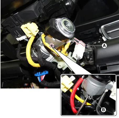 | 4. | Disconnect the immobilizer connector (A) and press the locking pin (B) using an awl. |