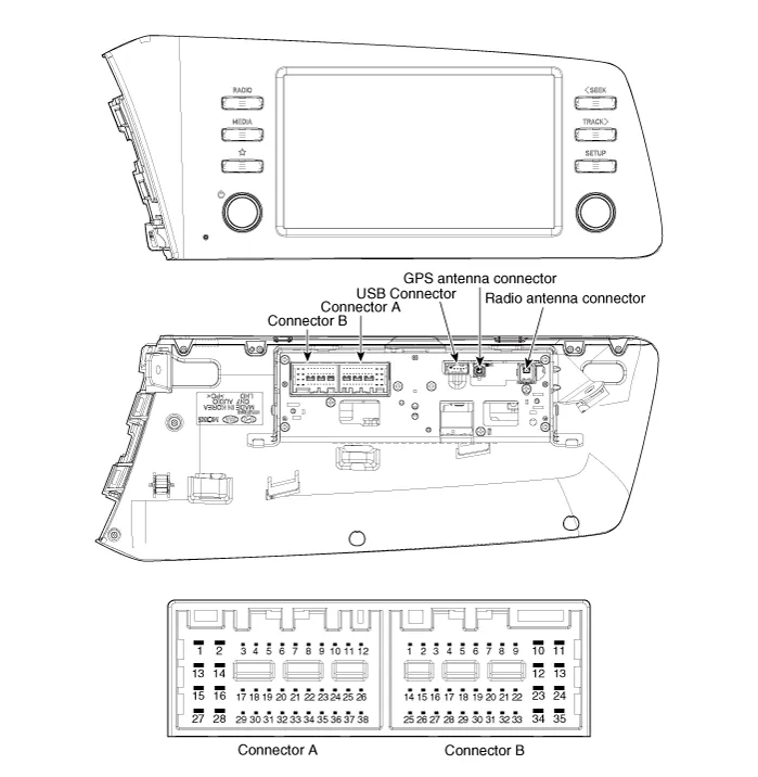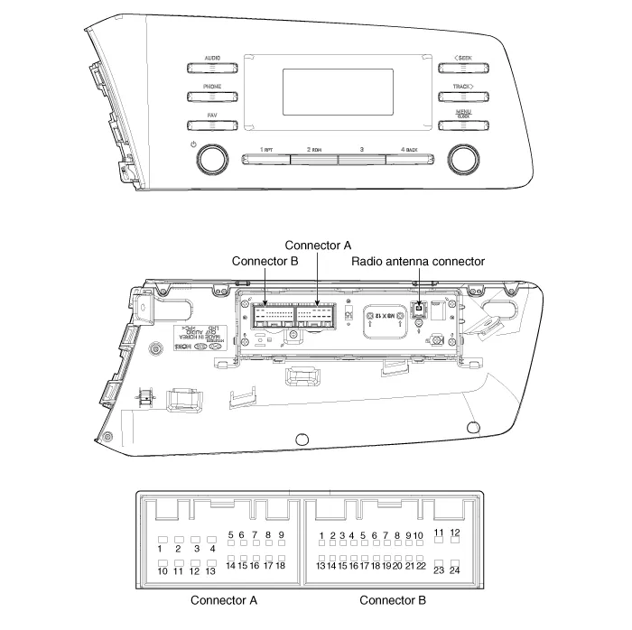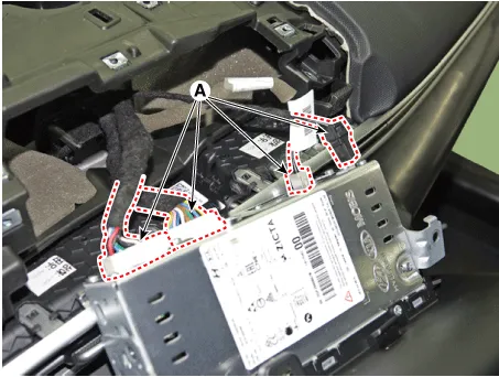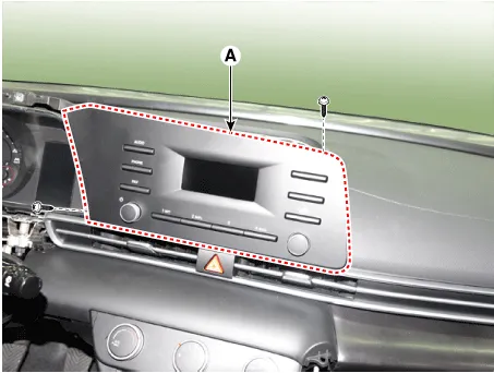 | 8. | Remove the audio head unit after disconnecting the connectors and cable (A).