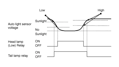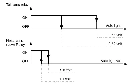 Check if the auto light control operates like a timing chart shown below. Tail lamp output and head lamp (Low) output is controlled based on the auto light sensor's input (illumination intensity) when the Auto Light Switch in Multi-Function Switch is turned ON, and the vehicle is in IGN1 or IGN2 ON Mode. If IGN1 = ON, BCM detects this voltage, and if the voltage exceeds rated voltage, then auto light failure occurs. (below 4V or above 6V)