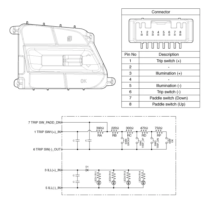 | 2. | Check for resistance between terminals in each switch position (RH).