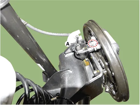 | 6. | Loosen the right-rear brake bleed screw (A) to allow air to escape from the system. Then tighten the bleed screw securely. [Front]