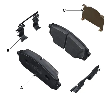 | 1. | Check the pad wear. Measure the pad thickness and replace it, if it is less than the specified value.