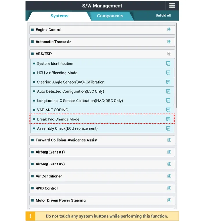 | 14. | After replacing the brake pad (EPB applied), perform "Brake Pad Replacement Mode" using the diagnostic tool.