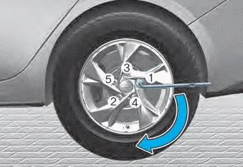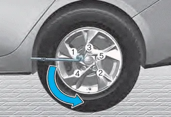 13. Use the wheel lug nut wrench to tighten the lug nuts in the order shown. Double-check each lug nut until they are tight. After changing tires, have an authorized HYUNDAI dealer tighten the lug nuts to their proper torque as soon as possible.