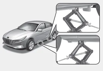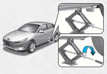 8. Insert the jack handle into the jack and turn it clockwise, raising the vehicle until the tire clears the ground. Make sure the vehicle is stable on the jack.