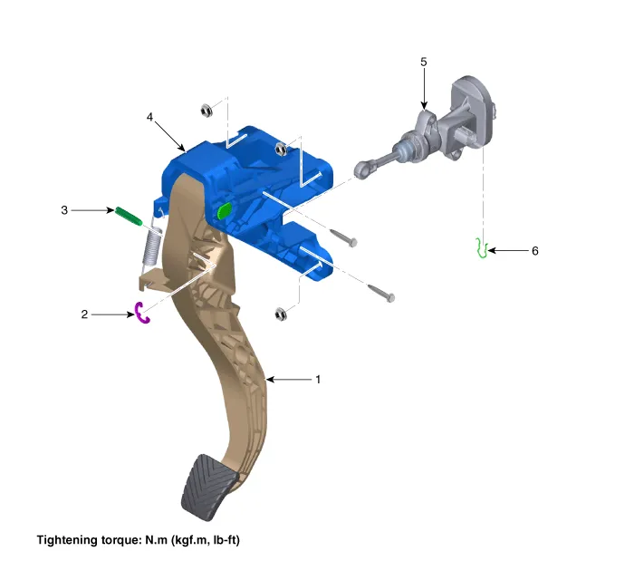 | 1. Clutch pedal arm 2. Clip 3. Push rod pin | 4. Clutch pedal assembly 5. Clutch master cylinder 6. Clip |