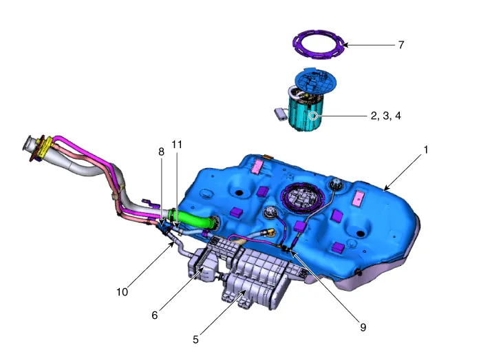 | 1. Fuel Tank 2. Fuel Pump 3. Fuel Fiter 4. Fuel Pressure Regulator 5. Canister 6. Fuel tank air filter | 7. Fuel pump plate cover 8. Fuel filler hose 9. Vapor hose 10. Ventilation hose 11. Leveling hose |