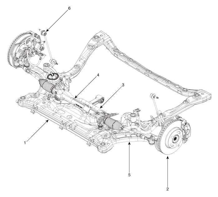 | 1. Front sub frame 2. Front axle 3. Front stabilizer bar | 4. Steering gearbox 5. Front lower arm 6. Front stabilizer bar link |