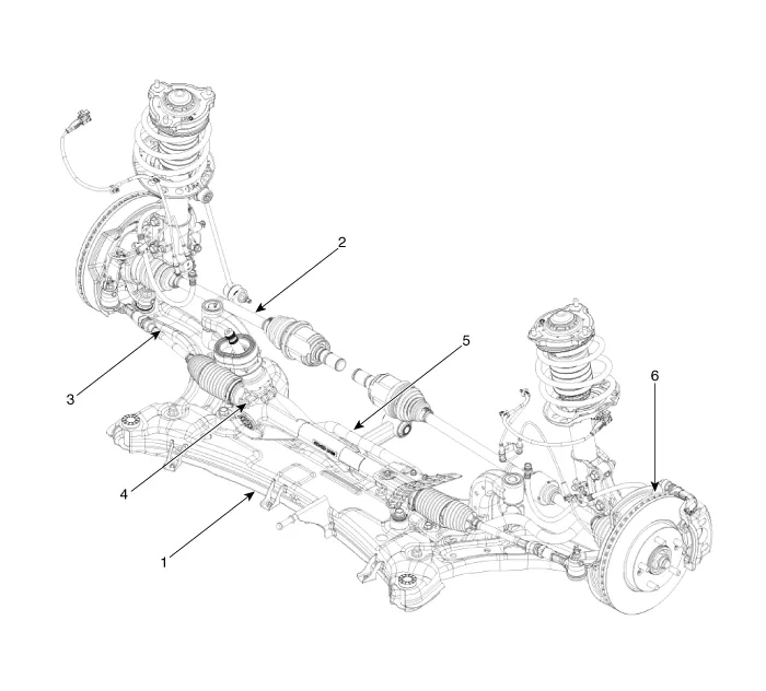 | 1. Sub frame 2. Drive shaft 3. Lower arm | 4. Steering gearbox 5. Stabilizer bar 6. Front axle assembly |