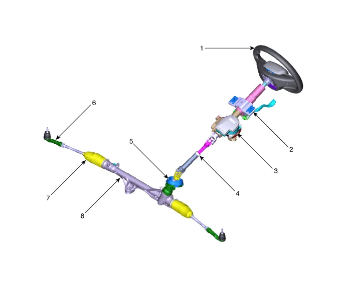 | 1. Steering wheel 2. Steering column 3. MDPS power pack 4. Universal joint | 5. Dust cap 6. Tie rod end 7. Bellows 8. Steering gear box |