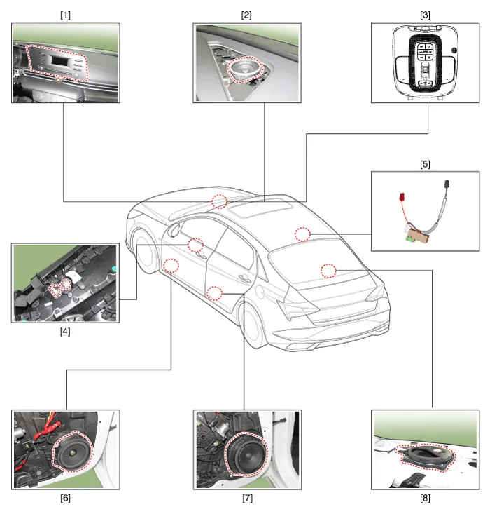 | 1. Audio unit 2. Center speaker 3. Hands-free mic (Built-in overhead console) 4. Tweeter speaker | 5. Glass antenna amplifier 6. Front door speaker 7. Rear door speaker 8. Woofer speaker |