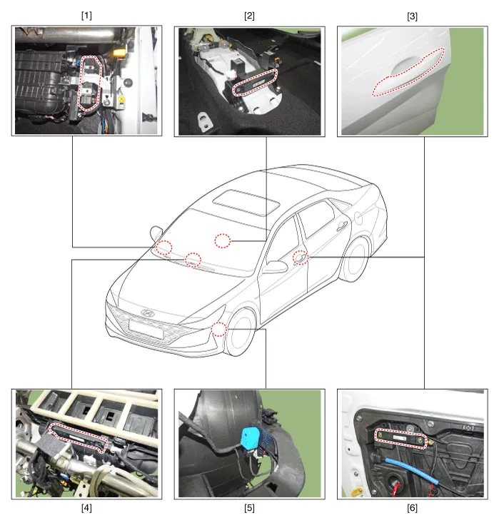 | 1. Smart key unit (IBU) 2. Interior antenna 2 3. Door outside handle | 4. Interior antenna 1 5. Buzzer |