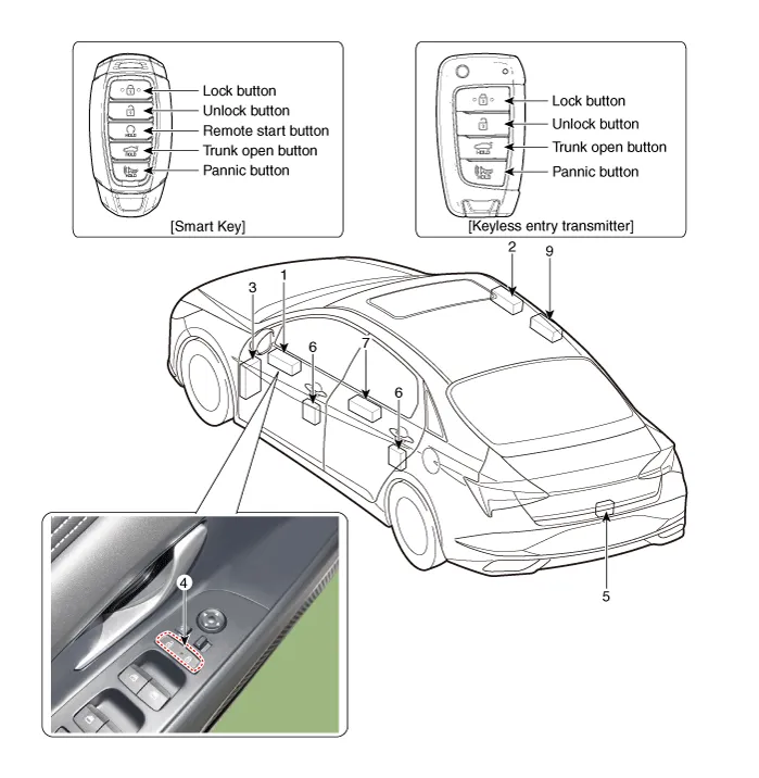 | 1. DDM (Driver Door Module) 2. ADM (Assist Door Module) 3. Integrated Central Control Unit (ICU) 4. Door lock knob 5. Trunk lid actuator | 6. Door latch module 7. Door lock/unlock switch 8. RLDM (Rear Left Door Module) 9. RRDM (Rear Right Door Module) |