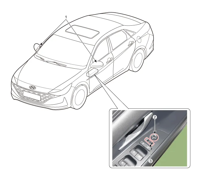 | 1. Power door mirror 2. Power door mirror switch | 3. Power folding mirror switch |