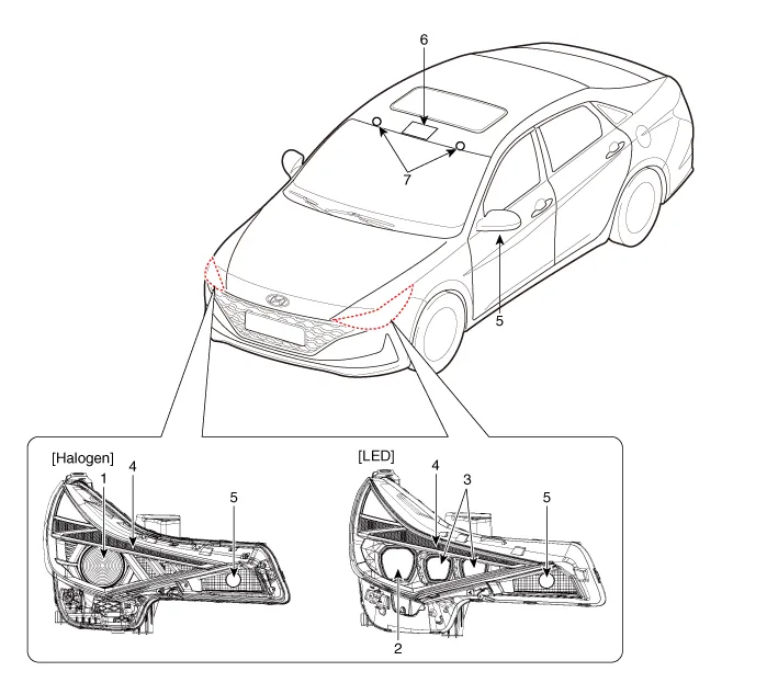 | 1. High/Low beam 2. Low beam 3. High beam 4. Position lamp&DRL | 5. Front turn signal lamp 6. Map lamp 7. Vanity lamp |