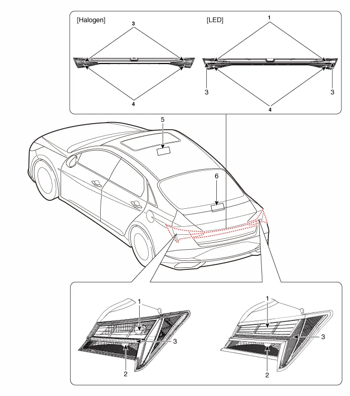 | 1. Stop lamp 2. Turn signal lamp 3. Tail lamp | 4. Back up lamp 5. Room lamp 6. High mounted stop lamp |
