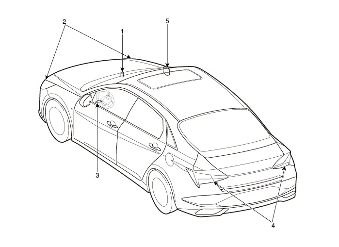 | 1. Auto light sensor 2. Head lamps 3. Lighting switch (Auto) | 4. Rear combination lamps 5. Integrated body control unit (IBU) |