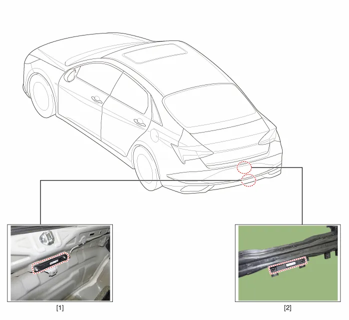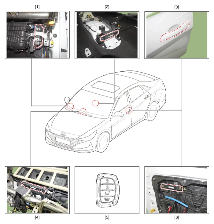 | 1. Smart key unit (IBU) 2. Interior antenna 2 3. outside door handle | 4. Interior antenna 1 5. FOB Key 6. Door antenna |