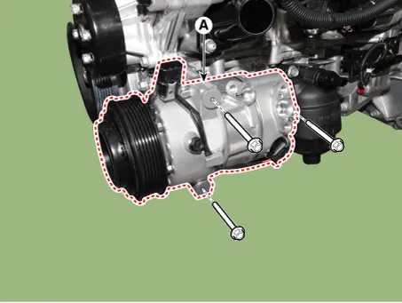 | 9. | Remove the compressor (A) by loosening the mounting bolts.