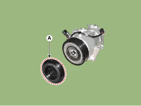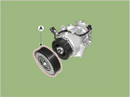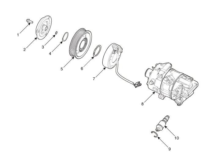 | 1. Clutch bolt 2. Disc & Hub assembly 3. Air gap spacer 4. Retainer (A) 5. Pulley 6. Retainer (B) | 7. Clutch magnetic coil 8. Compressor 9. Electric Control Valve(ECV) Snap ring 10. Electric Control Valve (ECV) |