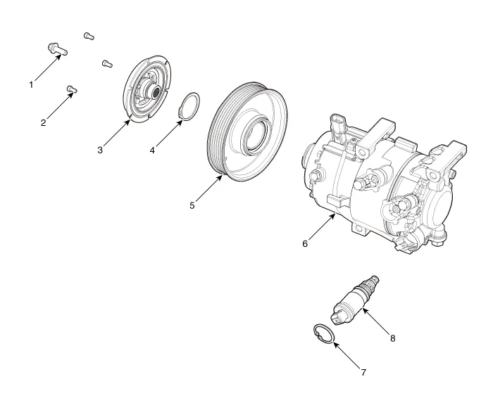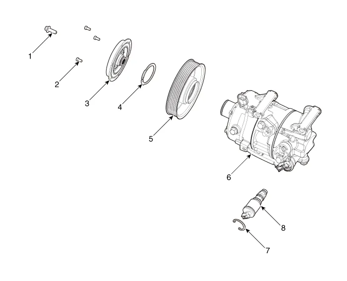 | 1. Clutch bolt 2. Limiter bolt 3. Disc & Hub assembly 4. Snap ring | 5. Pulley 6. Compressor 7. Electric Control Valve(ECV) Snap ring 8. Electric Control Valve (ECV) |
