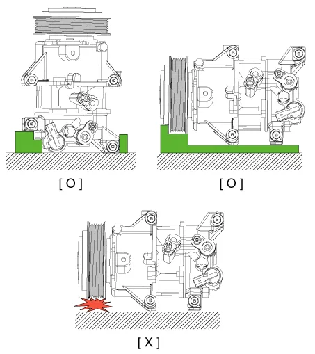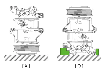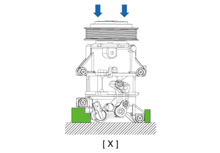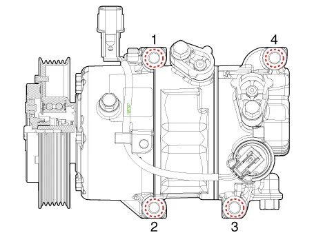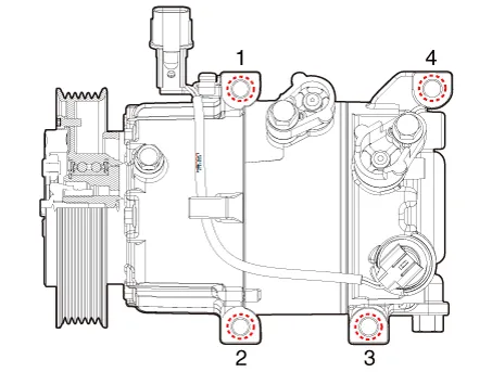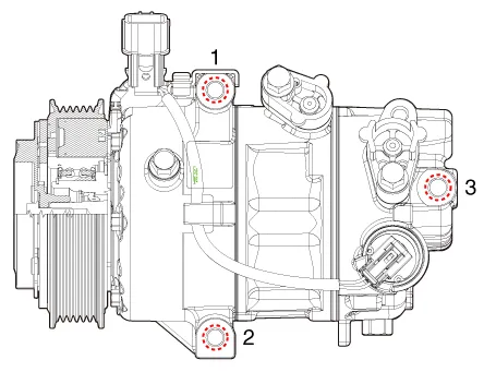 | 1. | Make sure the compressor mounting bolt with the correct length is screwed in. Tighten the mounting bolts with the specified tightening order.