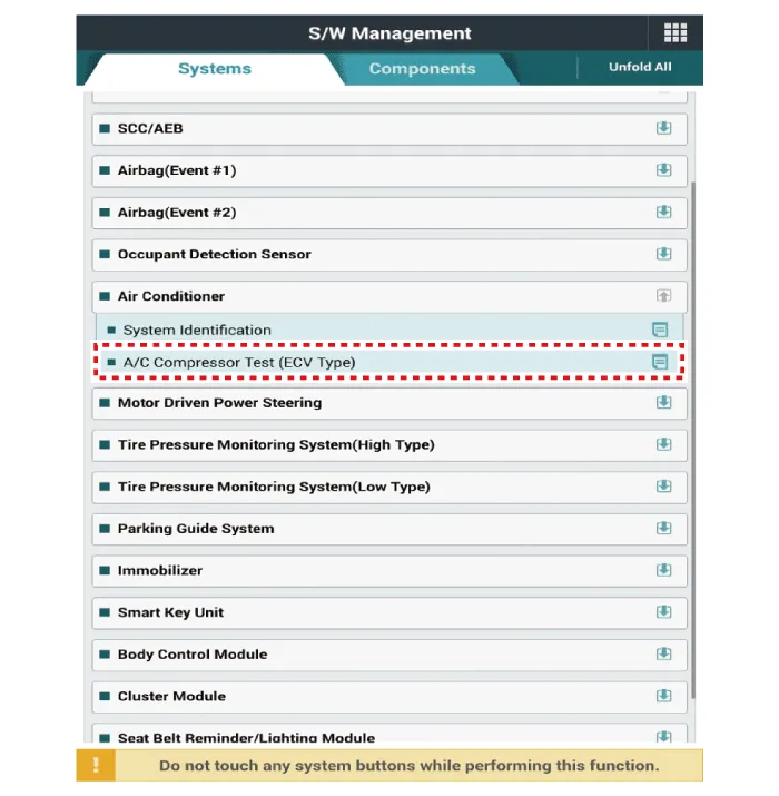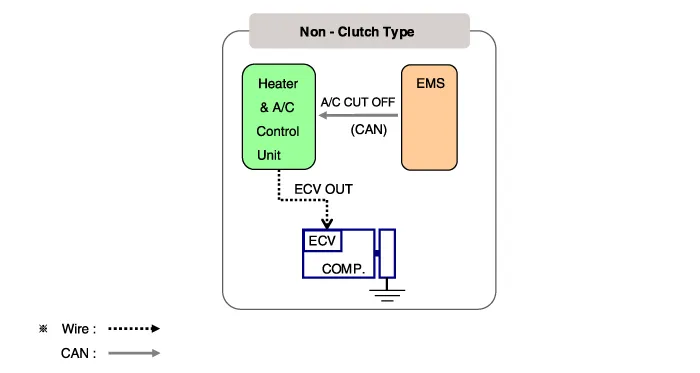 | 1. | Connect diagnostic tool to the vehicle and select 'Aircon Compressor Test(ECV type)' [ECV1]