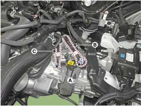 | 7. | Install the shift cable (B) and the select cable (C) and then insert the snap pin (A).