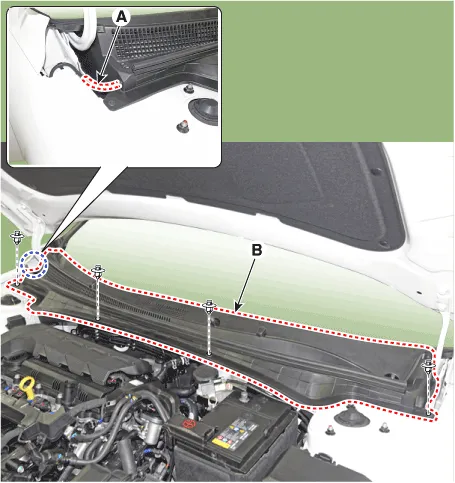| 4. | Detach the clips, then remove the cowl top cover (B).