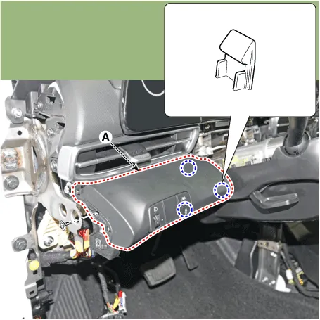 | 3. | Remove the crash pad garnish [LH] | 1) | Using screwdriver or remover, remove the steering column shroud upper panel (A).