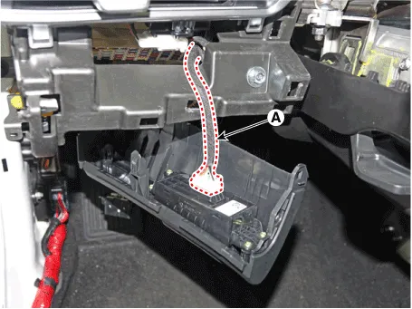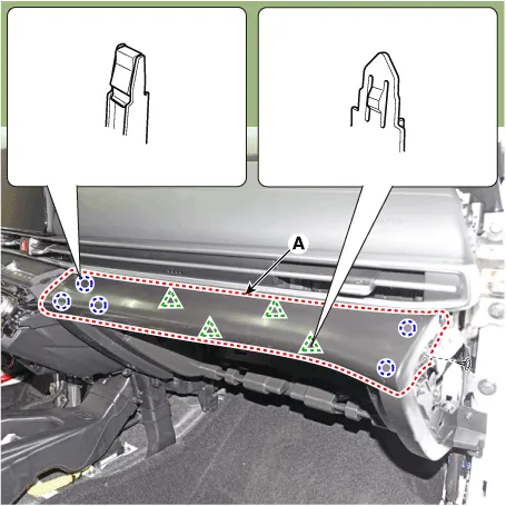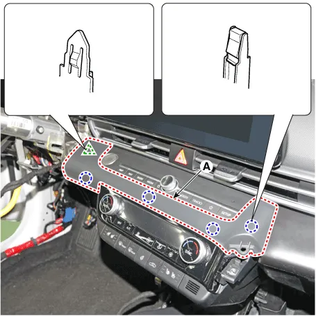 | 2) | Loosening the mounting screws, using a screwdriver or remover, remove the crash pad garnish (A).