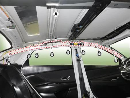 | 4. | Remove the curtain airbag module (A) after loosening the mounting bolts.