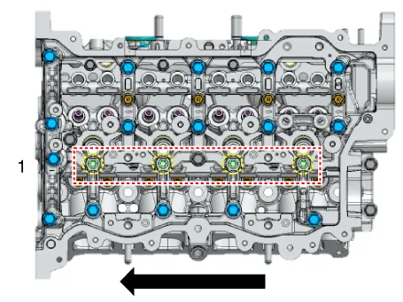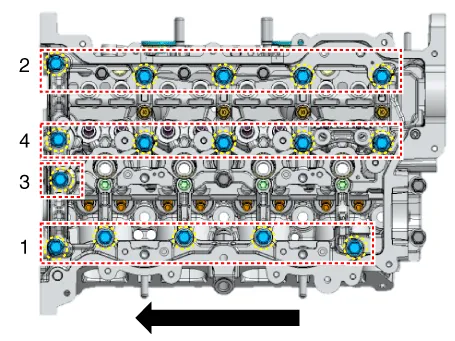 6. Tighten the CVVD assembly mounting bolts (M8) in sequence shown below. Tightening torque : 18.6 - 22.6 N.m (1.9 - 2.3 kgf.m, 13.7 - 16.6 lb-ft) |