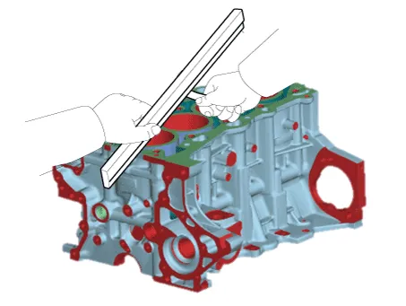 | 3. | Inspect the top surface of cylinder block for flatness. Using a precision straight edge and feeler gauge, measure the surface contacting the cylinder head gasket for warpage.