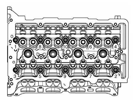 3. Provisionally tighten the CVVD assembly mounting bolts (M8) in sequence shown below. Tightening torque : 9.8 - 11.8 N.m (1.0 - 1.2 kgf.m, 7.2 - 8.7 lb-ft) |