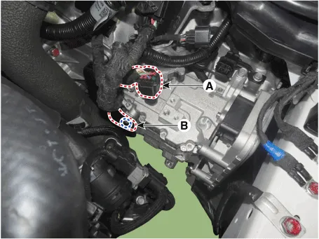 | 5. | Disconnect the inhibitor switch connector (A) and then loosening the bolts and then remove the wiring bracket (B).