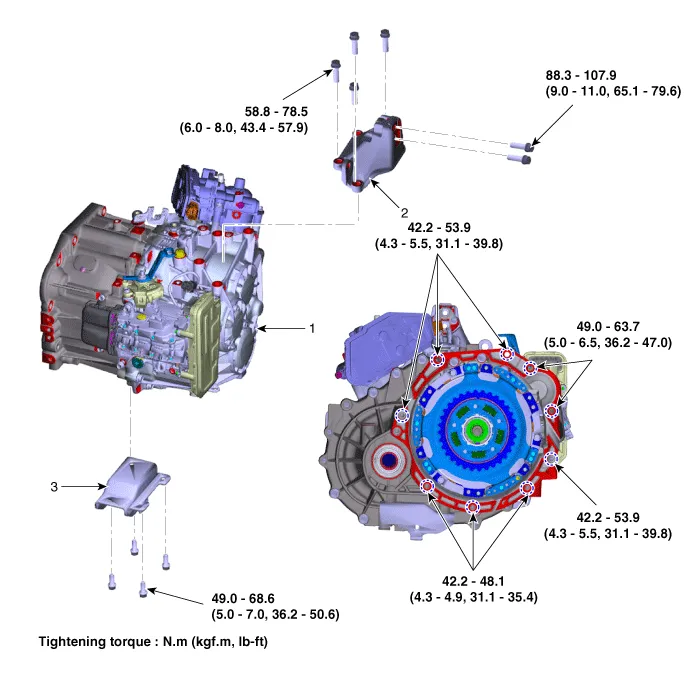 | 1. DCT (Dual Clutch Transmission) assembly 2. DCT support bracket | 3. Roll rod support bracket |