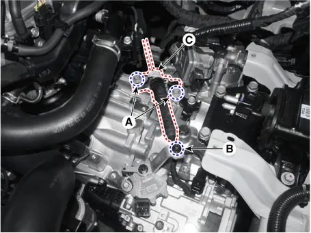 | 4. | Disconnect the input speed sensor connector (A) and TCM connector (B) and then loosening the bolts and then remove ground line (C).