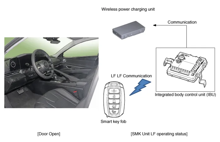 | 5. | SMK unit LF frequency interference prevention This function prevents interference between the wireless charging frequency and smart key unit frequency band. | (1) | Wireless charging is stopped when the door is open or the SMK unit is in LF mode (searching for smart key). e.g. Wireless charging function is stopped if the driver carries the smart key out of the vehicle during IG ON.