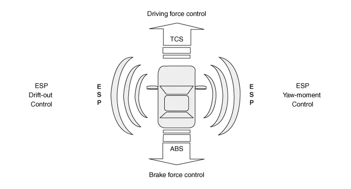 The stability control feature works under all driving and operating conditions. Under certain driving conditions, the ABS/TCS function can be activated simultaneously with the ESP function in response to a command by the driver.