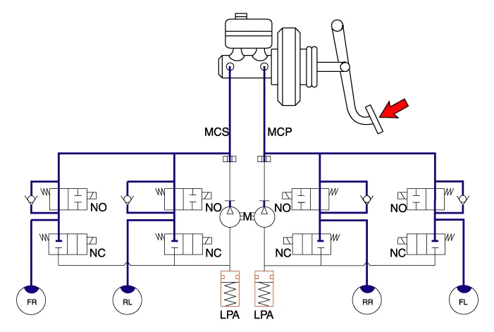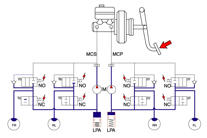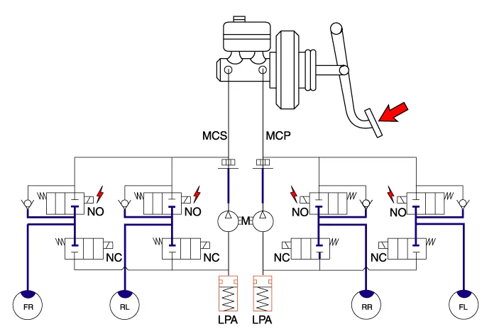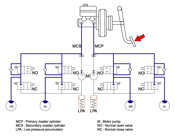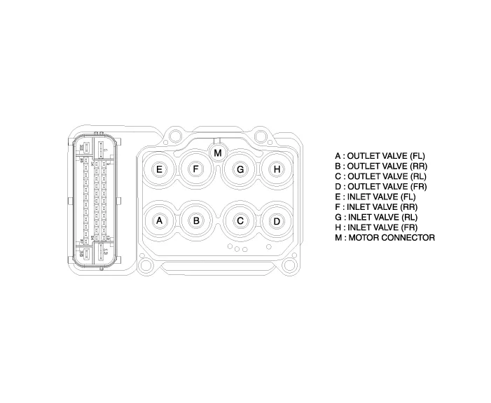 | 4. | Increase Mode If HECU determines there's no lock-up in the wheel, HECU cuts voltage to solenoid valve. So voltage is not supplied to each solenoid valve, brake fluid passes through the inlet valve to wheel cylinder, resulting in pressure increase.