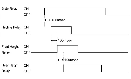 | 1. | The motor operation shall be delayed for 100±10msec for preventing the overlapping of inrush circuit during motor start and the priority at this case shall be as follows. Slide > Backrest adjustment >Front height adjustment >Rear height adjustment Operation time chart