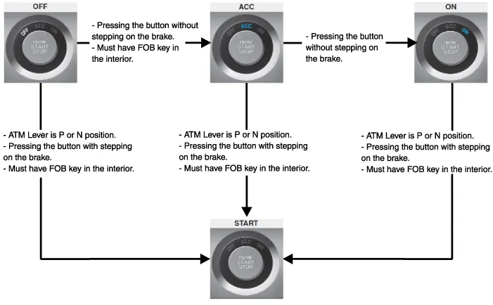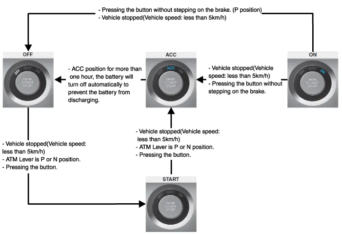 | The engine is off and returned to the ACC state when the button is pressed for 2 seconds and more than 3 times successively within 3 seconds during driving. The restarting is available for next 30 seconds regardless of FOB key and the electric power is changed through OFF → ACC→IGN→OFF by pressing the button without stepping on the brake (or with stepping on the brake) inside the car with FOB key. (However, when it is not in P position, ACC↔IGN is repeated. The conversion to OFF is impossible.) |